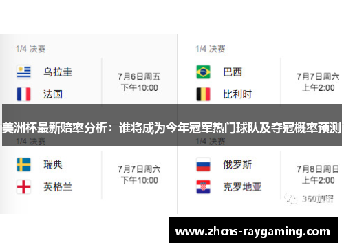 本文将围绕美洲杯最新赔率分析展开讨论,重点分析哪些球队被认为是今年美洲杯的冠军热门,并对各队的夺冠概率进行预测。随着赛事的临近,赔率的变化和各支球队的实力对比成为了广大球迷和投注者关注的焦点。本文将从四个方面对美洲杯的冠军热门球队进行深入探讨:首先,我们将分析影响赔率变化的关键因素,包括球队的历史表现、球员实力及其他外部因素;其次,讨论主要球队的赔率及其影响,预测哪些球队有望赢得冠军;接着,评估各支球队的夺冠概率,并结合分析给出具体的赔率解读;最后,基于前述分析,进行总结预测,指出哪支球队可能最终脱颖而出,成为美洲杯冠军。通过本文,读者将能够全面了解美洲杯赔率的趋势及各球队的竞争态势。